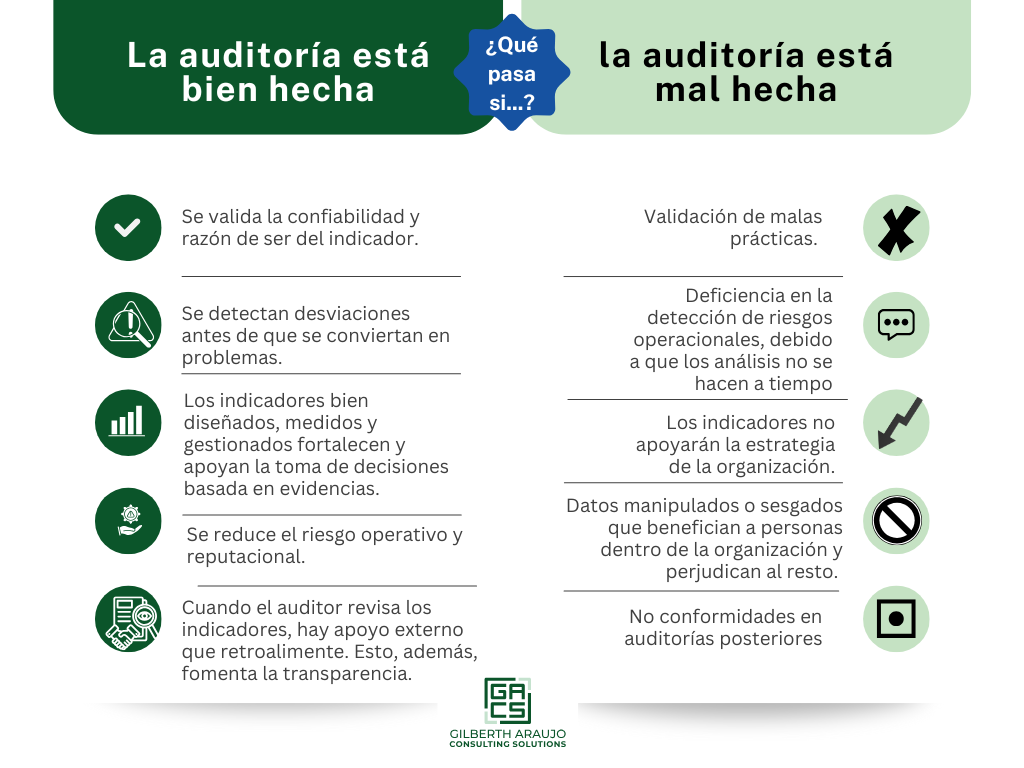 El auditor toma el informe de los indicadores de calidad: allí se ven tablas, fórmulas, resultados, gráficos y colores. Todo parece partir de un trabajo metódico y acucioso. Un ojo poco entrenado podría concluir que el documento es correcto. Pero el auditor sabe lo que no puede faltar y enseguida busca comprobar si le están presentando evidencias de que los indicadores están bien diseñados, se miden correctamente (con datos fiables y trazables) y se usan de manera adecuada (los reportes se generan a tiempo para tomar decisiones con esa base). Para verificarlo, el profesional se enfoca en: