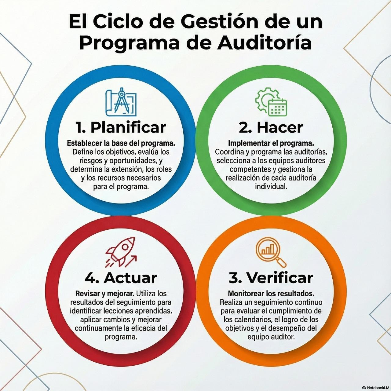 • objetivos del programa de auditoría: define qué quieres lograr con el programa: verificar la eficacia del sistema de gestión, identificar brechas con requisitos aplicables, hacer seguimiento a políticas específicas, definir qué tan adecuado es el nivel de documentación, etc.