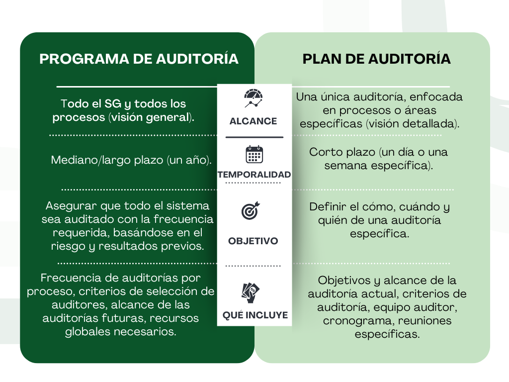 En cuanto a jerarquías, ambos son igualmente necesarios. Además, ISO 19011 en sus cláusulas 5. Gestión del programa de auditoría y 6.3.2 Planificación de la auditoría concibe la elaboración de los dos documentos. Es importante tener presente que el rol estratégico del programa es la previsión y asignación de recursos, mientras que el plan cuenta con un enfoque operacional centrado en la ejecución. Entre las diferencias clave tenemos:
