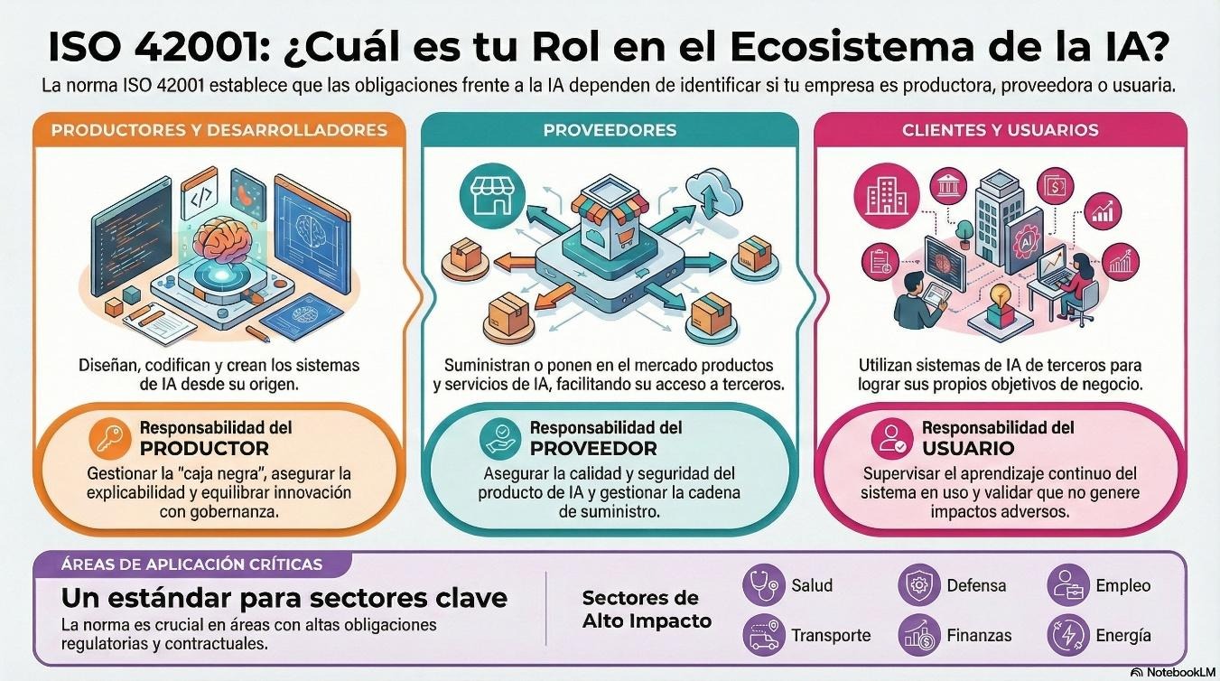 - Clientes y usuarios: si tu organización simplemente utiliza sistemas de IA para lograr sus objetivos, la norma también aplica. No necesita ser una empresa de software. Si trabajas en un banco, que usa IA para detectar fraudes, o un hospital, que la emplea para diagnósticos, estamos hablando de un usuario. Tu responsabilidad no es diseñar el algoritmo, sino gestionar su uso: supervisar el aprendizaje continuo (cómo cambia el comportamiento del sistema durante el uso) y validar que el sistema no genere impactos adversos en tu contexto específico.