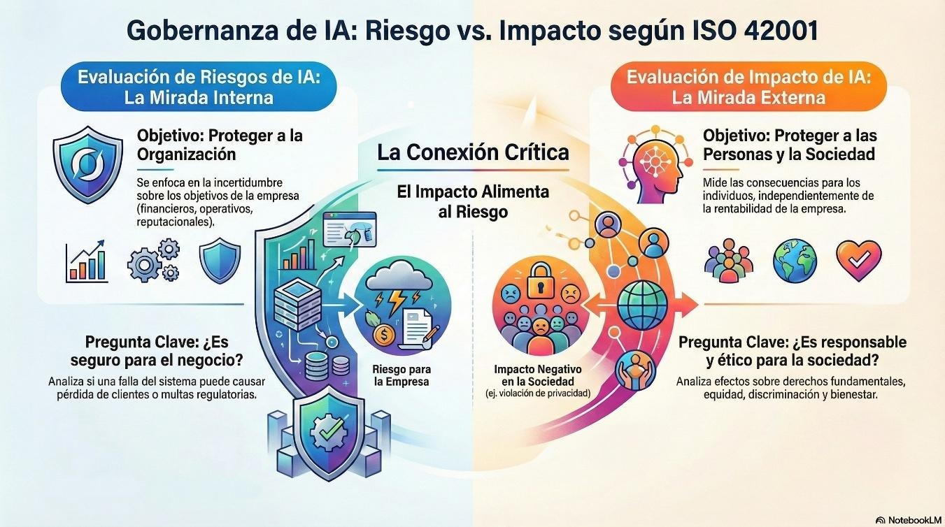 Si tu organización decide implementar la norma ISO/IEC 42001:2023 podrías enfrentarte con una dualidad que genera confusión: la exigencia de realizar una evaluación de riesgos y, por separado, una evaluación de impacto. ¿No son lo mismo? En la gestión tradicional de TI se suele ver como un mismo elemento, pero la IA requiere un enfoque distinto. Para entender el estándar, tomemos en cuenta que este opera con dos motores de análisis que, aunque interconectados, tienen objetivos y audiencias muy diferentes:
