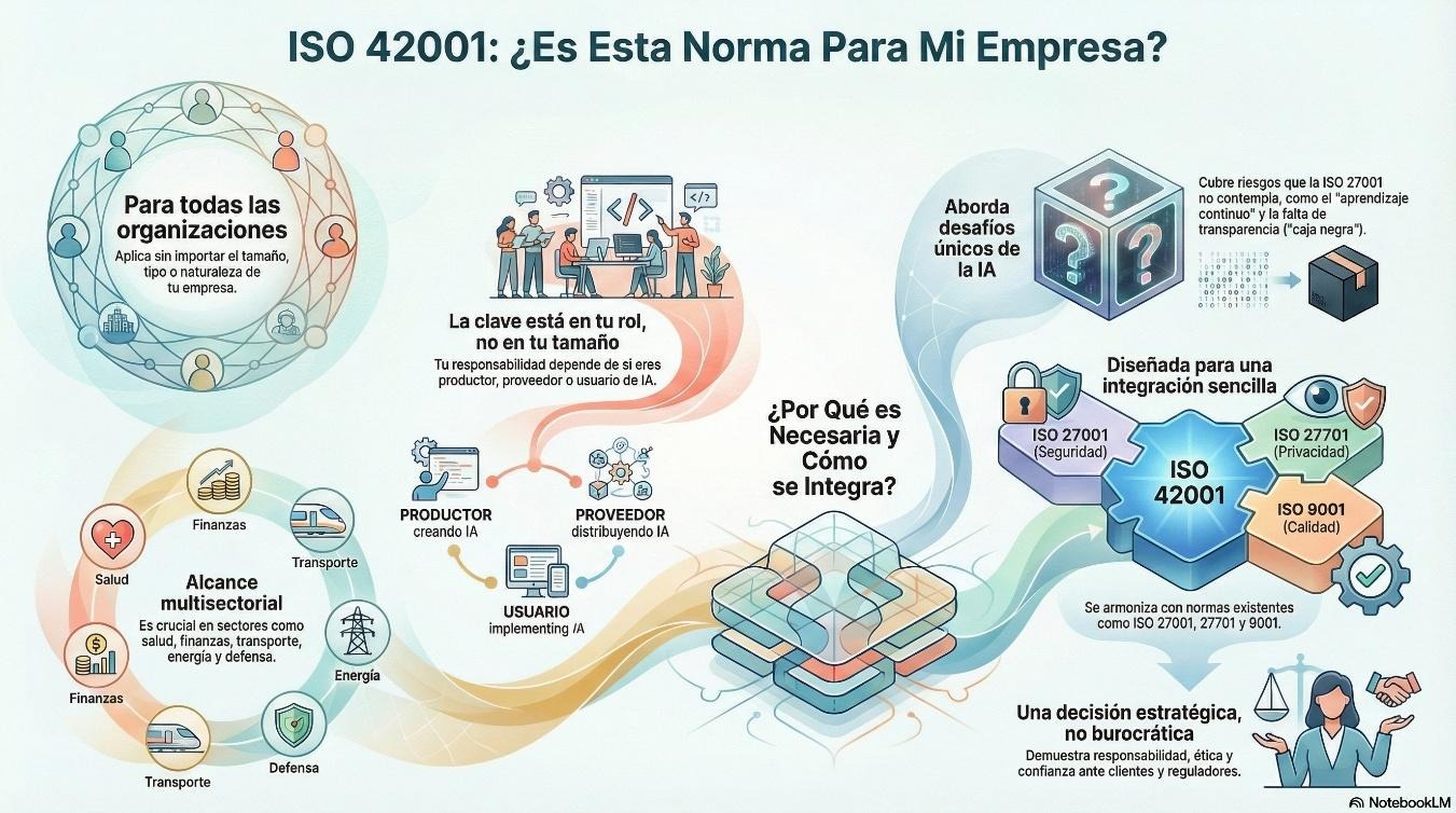 La norma está diseñada bajo la estructura armonizada para integrarse perfectamente con lo que ya has implementado, sea ISO/IEC 27001, para abordar los objetivos de seguridad de la información de forma sistemática; sea ISO/IEC 27701, determinante cuando los sistemas de IA procesan información de identificación personal; o ISO 9001, para reforzar la confianza del cliente en la calidad de los productos o servicios que incluyen IA. Si piensas que la aplicabilidad de este estándar solo abarca a empresas tecnológicas, te contamos que es muy útil para una gran variedad de sectores que están sujetos a obligaciones o compromisos contractuales, tales como salud, defensa, transporte, finanzas, empleo y energía.