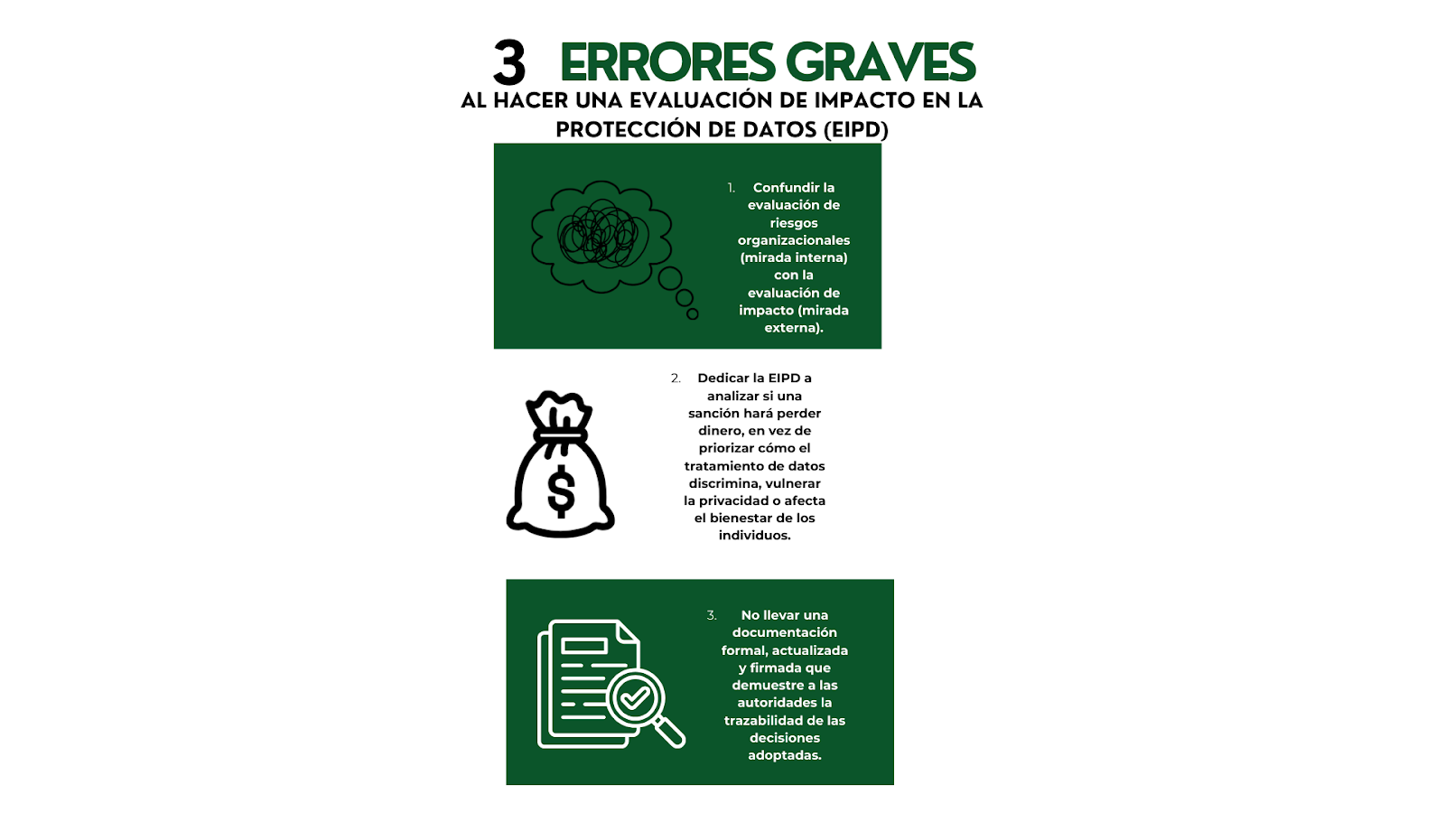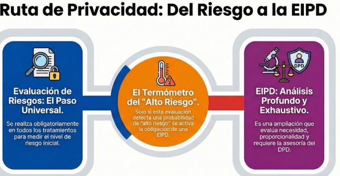 Antes de hacer la EIPD, hacemos la evaluación de riesgos. Pese a que son procesos complementarios, se diferencian porque el EIPD se centra en cuáles son los posibles impactos de la divulgación de los datos (afectación de los derechos y libertades de los titulares). Por su parte, la evaluación de riesgos permite saber si hay algún dato que tratemos que esté en riesgo. Y si lo está, hay que evaluar en dónde habrá impacto (incumplimiento legal, consecuencias financieras, administrativas, reputacionales y/o vulneración de derechos).