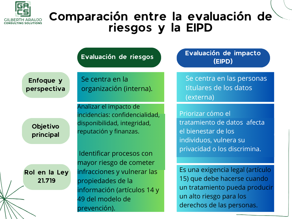 De manera análoga al artículo 35 del Reglamento General de Protección de Datos (RGPD), la legislación chilena exige a las organizaciones hacer no solo un análisis de riesgos general, sino un estudio de impacto especial y exhaustivo (EIPD) siempre que el tratamiento de datos represente un alto riesgo. Esto incluye tratamientos como decisiones automatizadas, evaluaciones de perfiles, o el uso de datos sensibles… La ley exige que las organizaciones implementen medidas técnicas, jurídicas y organizativas apropiadas para mitigar estos riesgos antes de iniciar cualquier tratamiento, para prevenir accesos no autorizados y asegurar la confidencialidad.