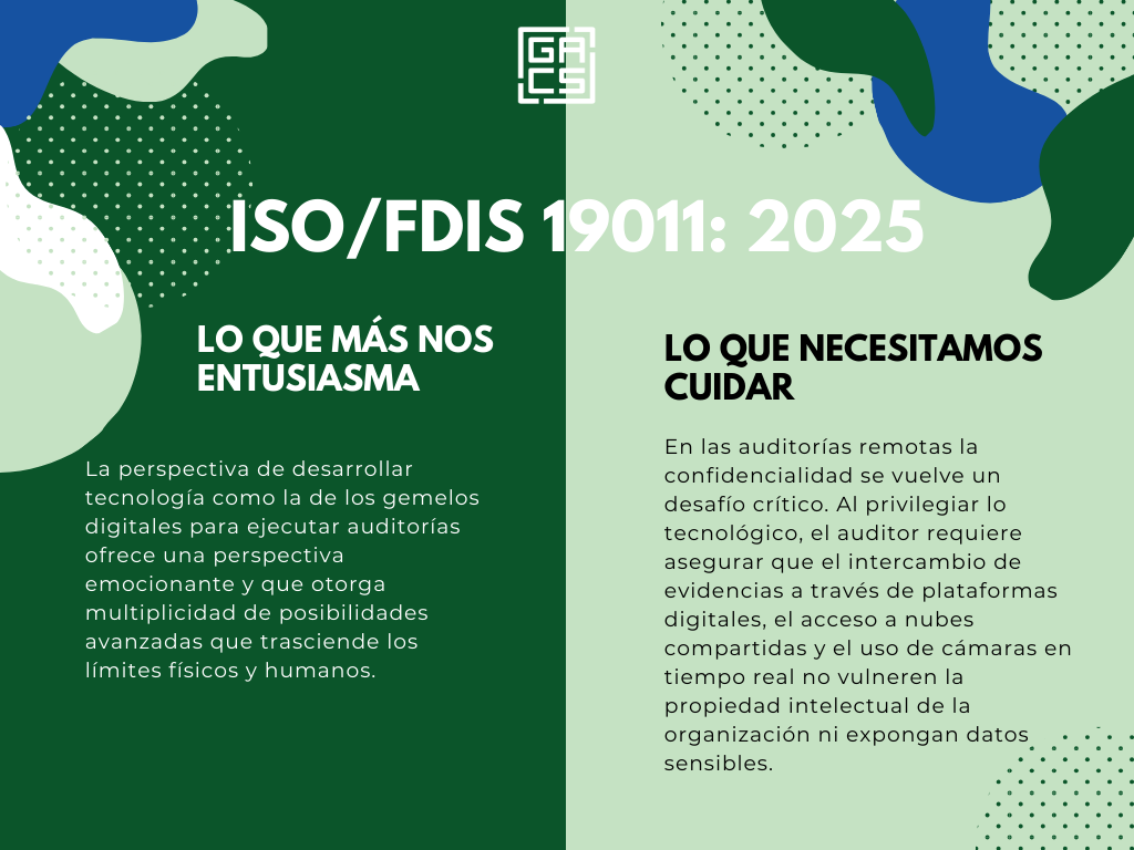 ISO/FDIS 19011: 2025 nos acerca a la ciencia ficción en cuanto a que introduce la idea de que es posible que ya no solo se audite a personas, sino a máquinas. Nos prepara para posibles técnicas de auditorías con gemelos digitales, definidos por IBM como representaciones virtuales de un objeto o sistema diseñado para reflejar un objeto físico con precisión, o para el uso de réplicas exactas de una infraestructura a las que se accedería empleando cámaras de realidad virtual que den ingreso a fábricas, salones y oficinas en ángulos y perspectivas a las que es difícil acceder presencialmente (la parte superior de un horno, máquinas en movimiento para observar si hay ineficiencia de componentes, rendimiento)… todo esto sin exponer al personal auditor. La norma aclara que esta es una capacidad que se puede desarrollar a futuro.